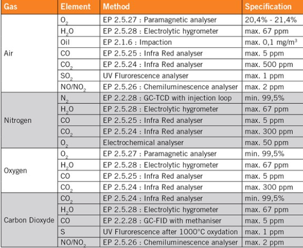 Die Qualitätsanforderungen für diese Gase sind in der Europäischen und der US-amerikanischen Pharmakopöe definiert. Zusätzlich zu den pharmakopöischen Vorgaben prüfen wir die Gase auch auf partikuläre und mikrobiologische Verunreinigungen. Die Kontamination des Gases darf dabei nicht höher sein als die des Raums, in dem es verwendet wird. Ein Gas, das z. B. in einem ISO-5-Raum (entspricht Klasse 100) eingesetzt wird, muss auch gemäß ISO-5-Spezifikationen analysiert werden. Die entsprechenden Grenzwerte für partikuläre und mikrobiologische Belastung sind in Tabelle 1 und 2 aufgeführt.