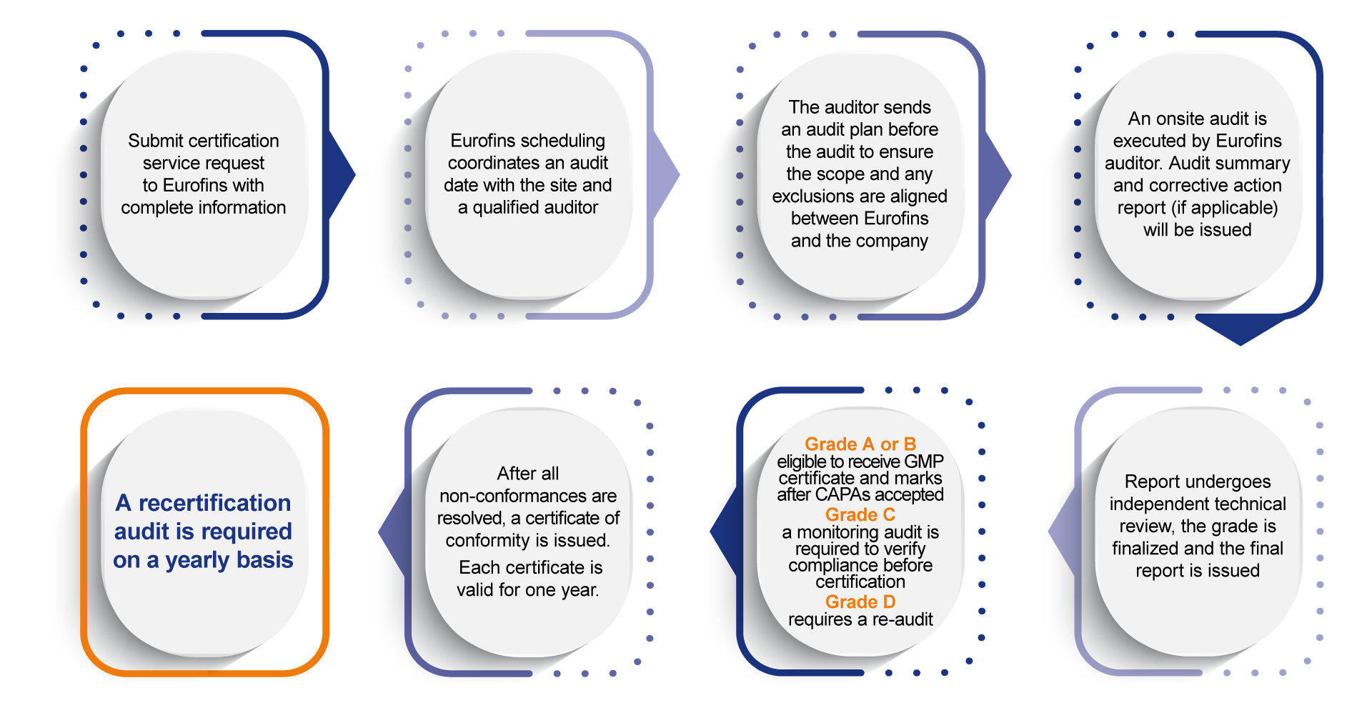 Manufacturers who meet all certification requirements receive a GMP certificate of conformity issued by Eurofins Healthcare Assurance.