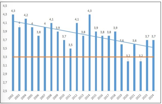 Figure 1: Average phosphorus content in spring silage. The minimum phosphorus requirement for a dairy cow producing 40 kg of milk is 3.3 g/kg (CVB, orange line). Source: Eurofins Agro 2025