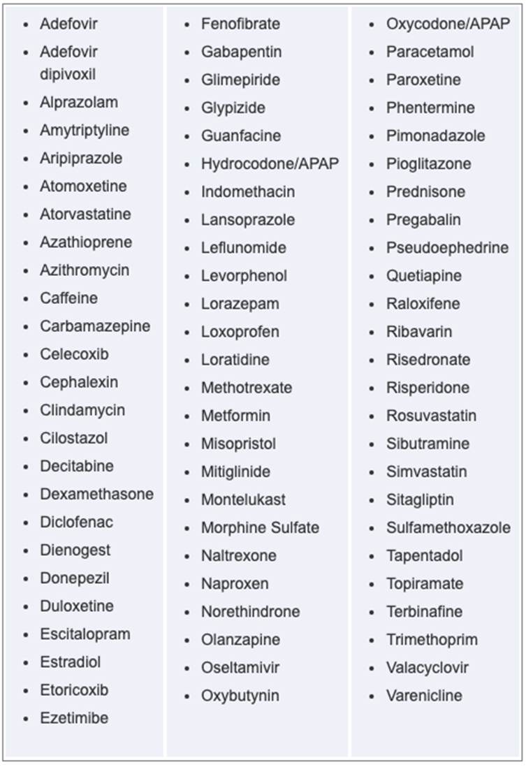 Nous testons des produits de référence largement utilisés, notamment l'atorvastatine, la duloxétine, la metformine, le paracétamol, la simvastatine et bien d'autres encore. Certains des produits que nous avons testés sont présentés au bas de cette page (liste non exhaustive).