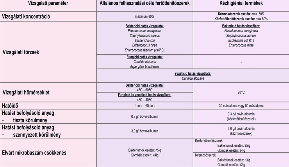 Az általános felhasználású fertőtlenítőszerek vizsgálatakor a szabványokban megadott (MSZ EN 1276:2020) megfelelő a baktericid hatás baktériumok esetén 5 nagyságrendnyi (105), gombák esetén (MSZ EN 1650:2020) 4 nagyságrendnyi (104) csökkenést kell a fertőtlenítőszernek biztosítania.